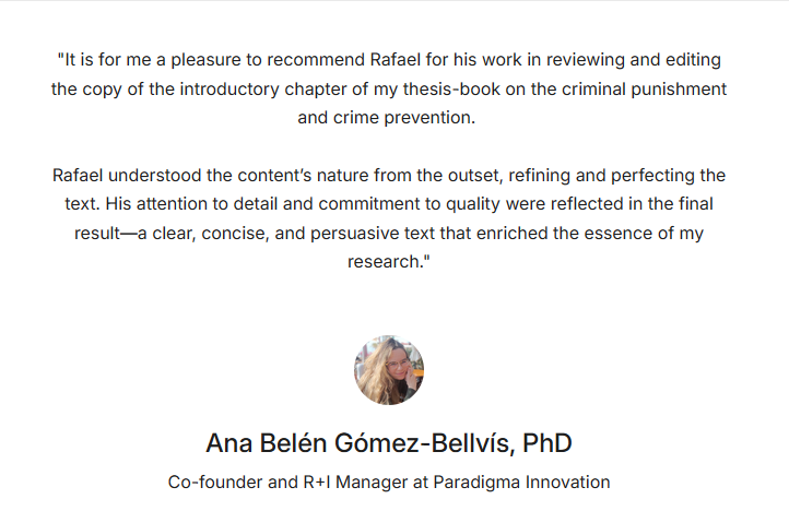 “It is for me a pleasure to recommend Rafael for his work in reviewing and editing the copy of the introductory chapter of my thesis-book on the criminal punishment and crime prevention.